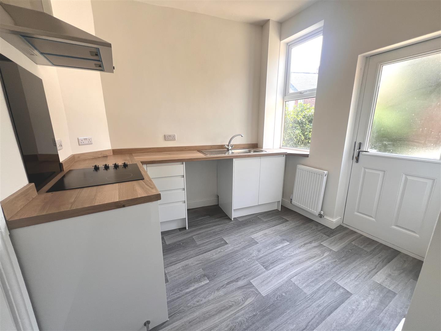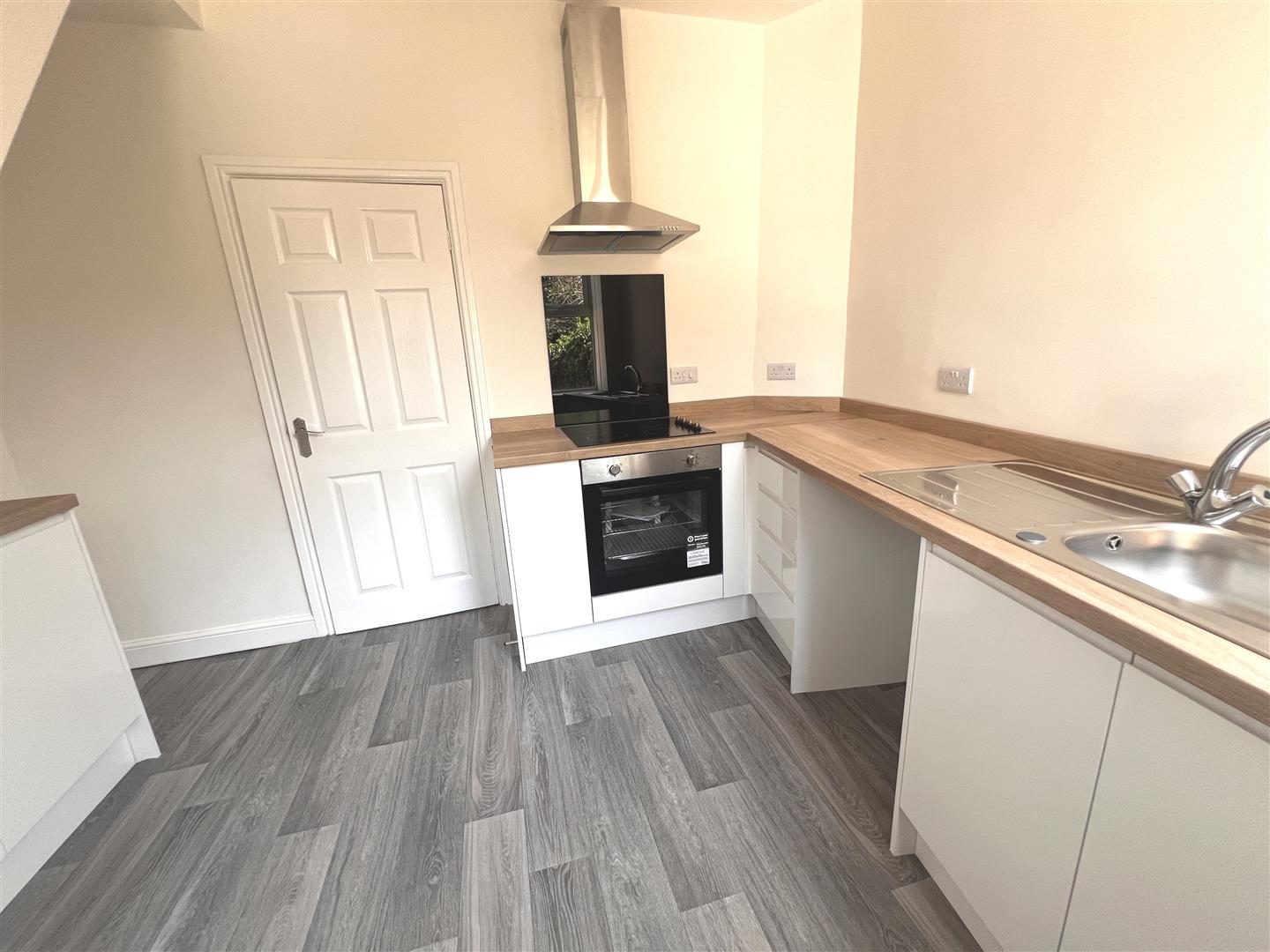 Fitted with modern units comprising an inset stainless steel sink with mixer tap and cupboard under, further base units, plus area of worktop surfaces. There is an integrated stainless steel oven with four ring ceramic hob and chimney style extractor hood above, plumbing for an automatic washing machine, rear facing window and rear access door. A staircase rises to the first floor.