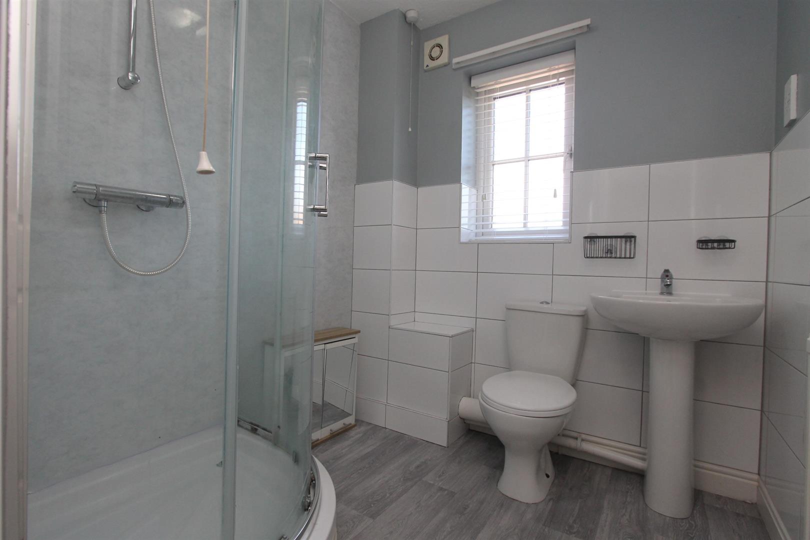 Fitted with a white three piece suite, comprising a corner shower enclosure, low flush WC and wash hand basin. There is an extractor fan, radiator and obscure glazed window.