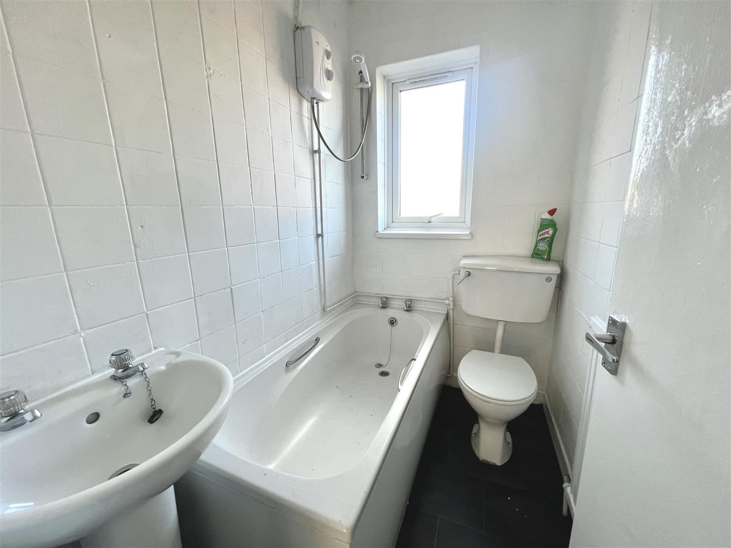Fitted with a white three piece suite, comprising a panel bath with electric shower over, low flush WC and wash hand basin. There is a radiator and obscure glazed window.