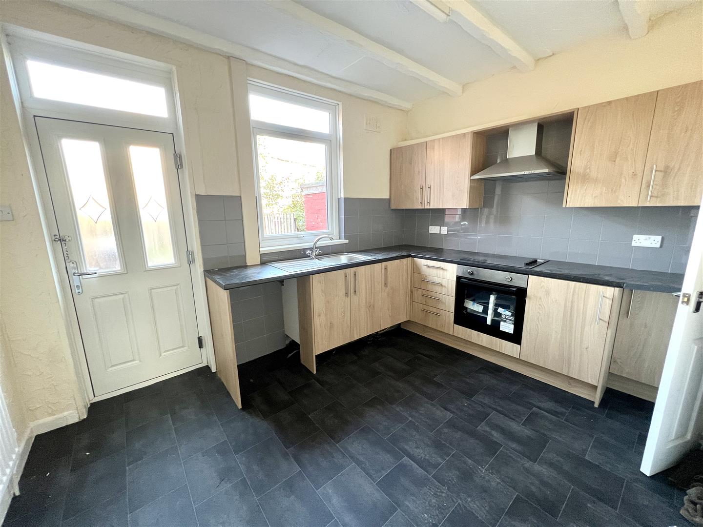 Fitted with a new kitchen, comprising a stainless steel sink with mixer tap and cupboard under, further base and wall mounted units, plus area of worktop surfaces with tiled splash backs. There is an integrated stainless steel oven with four ring ceramic hob and chimney style extractor hood above, space and plumbing for a washing machine, a radiator, rear facing window and composite part glazed rear external door. Access is also provided to the cellar.
