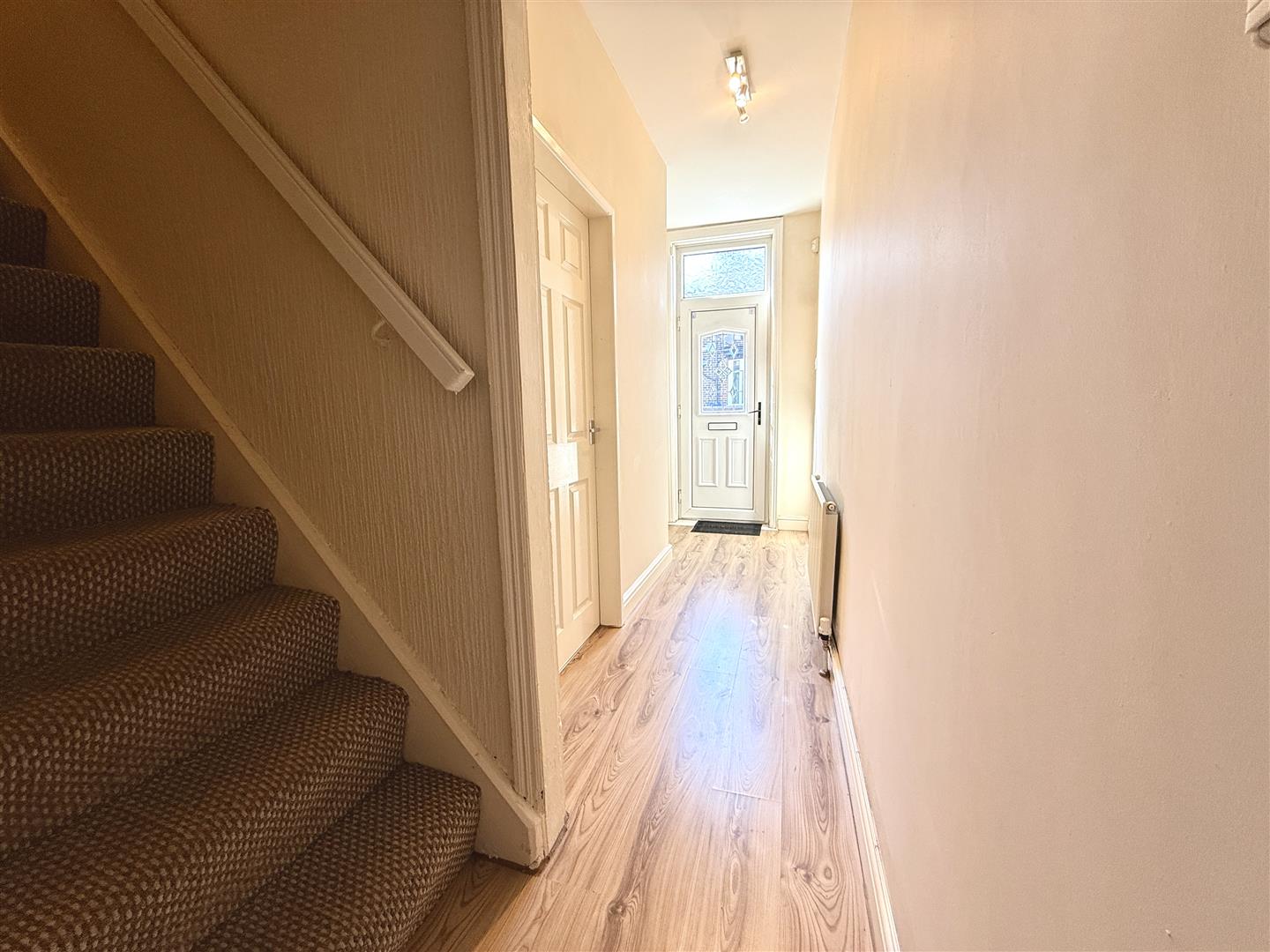 A UPVC part glazed entrance door opens into the hallway, which has a staircase to the first floor, wood laminate flooring and a radiator.